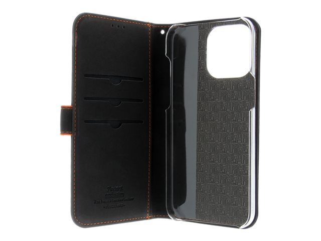 Insmat Exclusive - Lommebok for mobiltelefon - ekte skinn, polykarbonat, kartong+papir+aluminiumsfolie, bomullssting - svart / oransje - for Apple iPhone 15 Pro Max