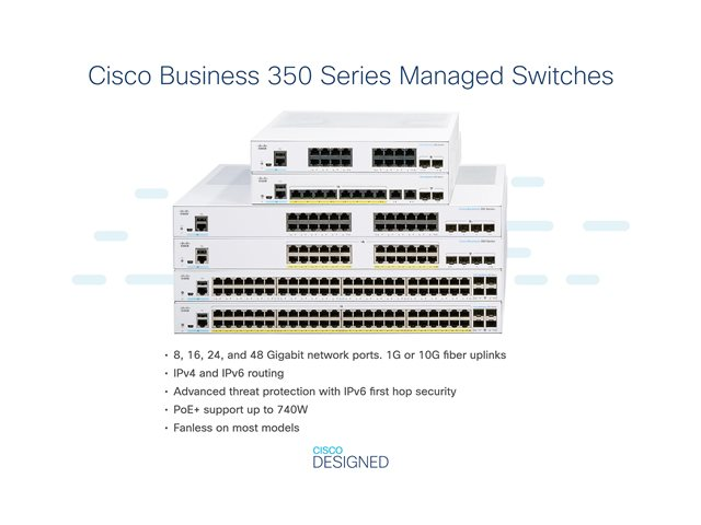 The Cisco Business CBS350-8S-E-2G switch is part of the fully managed switch line that delivers reliable and secure connectivity for small business networks. These switches accelerate your digital transformation by delivering full Layer 2/3 capabilities, intuitive web dashboard, advanced networking features, and PoE+ support.