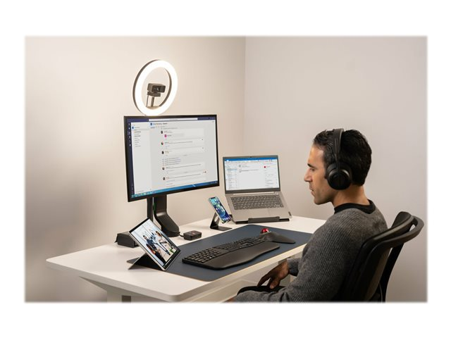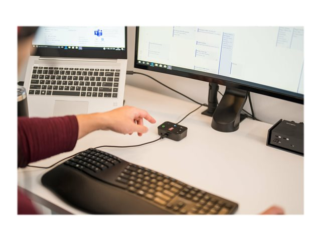Kensington's Universal 3-in-1 Pro Audio Headset Switch allows professionals to use their favorite wired or wireless headset (Bluetooth, USB-C, USB-A, or 3.5 mm) as they switch between different devices (laptops, phones, and tablets). Accommodates up to three different audio sources, automatically remembers previously paired devices, eliminates the need for multiple headsets, and works with Microsoft Teams, Google Meet, Zoom, WebEx, and more.